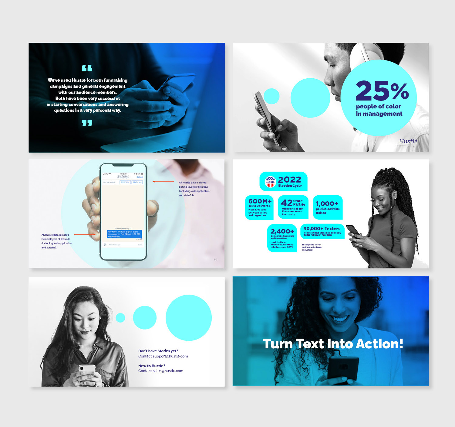 Hustle needed a brand refresh. By implementing a new color palette, photographic styling, and a more dynamic layout for information, Hustle now stands out among their competition as the most current, professional, yet fun and engaging texting platform choice.